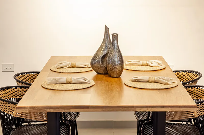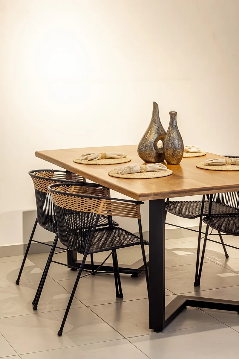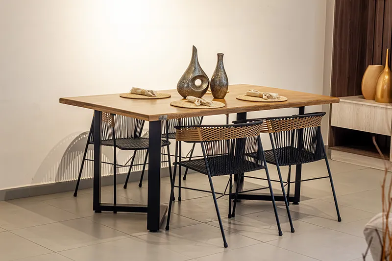 MESA COMEDOR CON TAPA EN MADERA (ROBLE, PINO O TECA) BASE EN HIERRO CON PINTURA ELECTROSTATICA