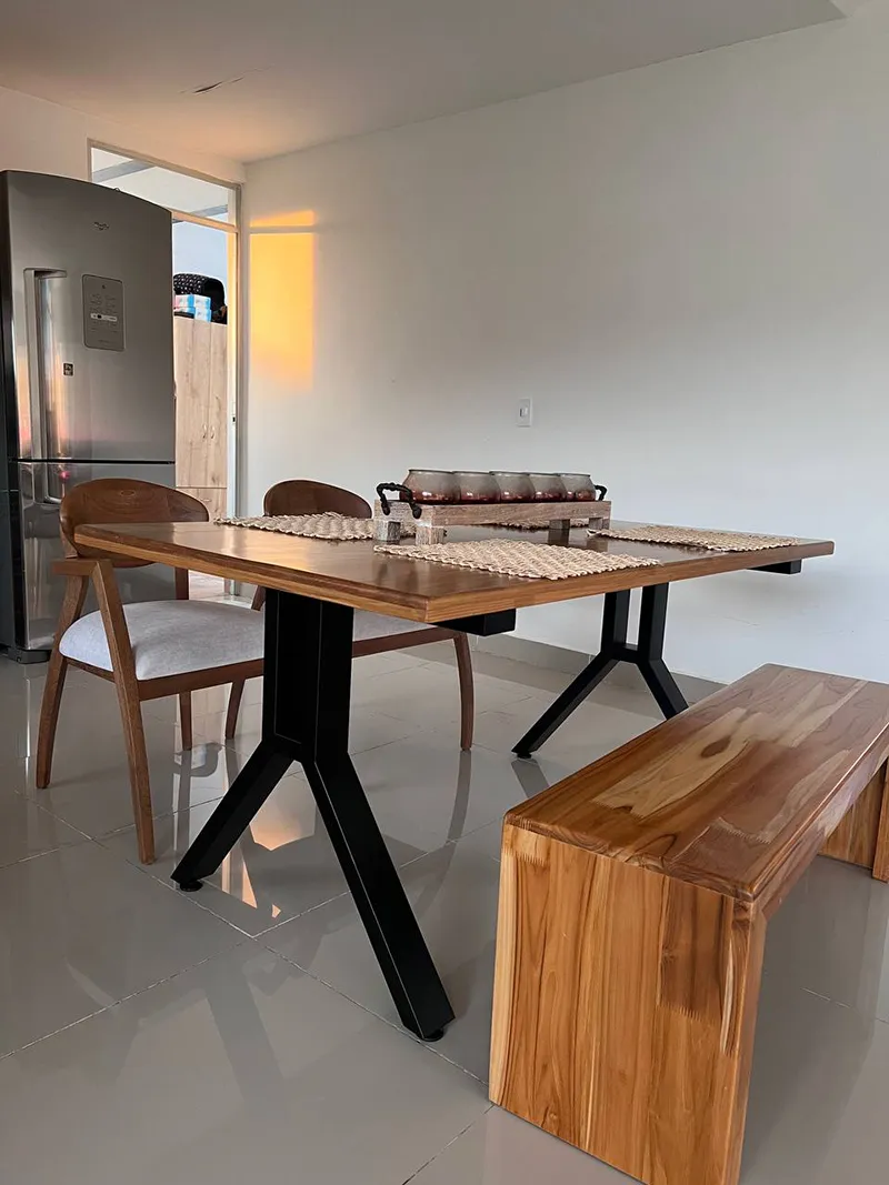 MESA COMEDOR CON TAPA EN MADERA (ROBLE, PINO O TECA) BASE EN HIERRO CON PINTURA ELECTROSTATICA