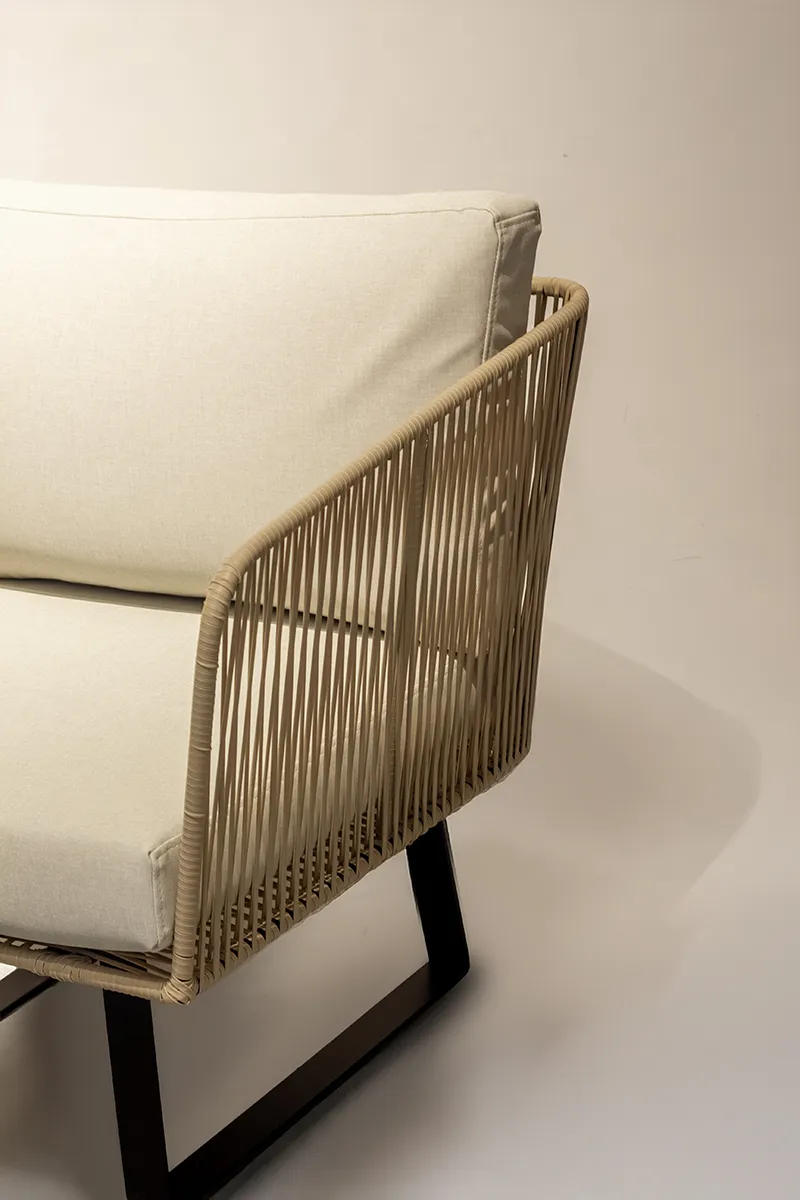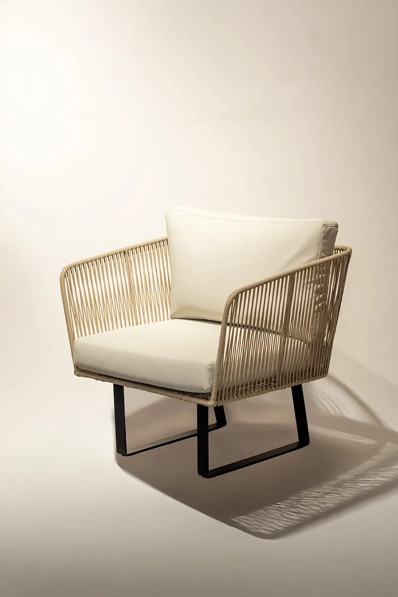 SILLAS PARA USO EXTERIOR TAPIZADAS CON TELA IMPERMEABLE Y TEJIDAS CON MIMBRE